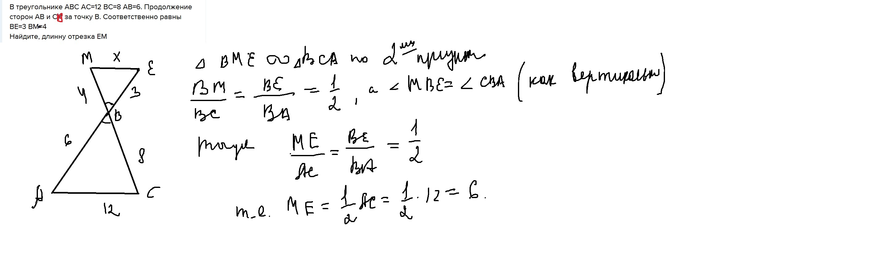 в треугольнике ABC AC=12 BC=8 AB=6. Продолжение сторон AB и СИ за точку B. Соответственно равны BE=3 BM=4