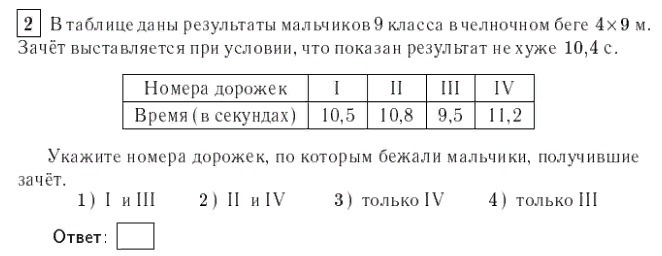 решение: 1ый не получил зачет, т.к. результат хуже 10,4, 2-ой не получил, 4-ый не получил. зачет получил только 3-ий