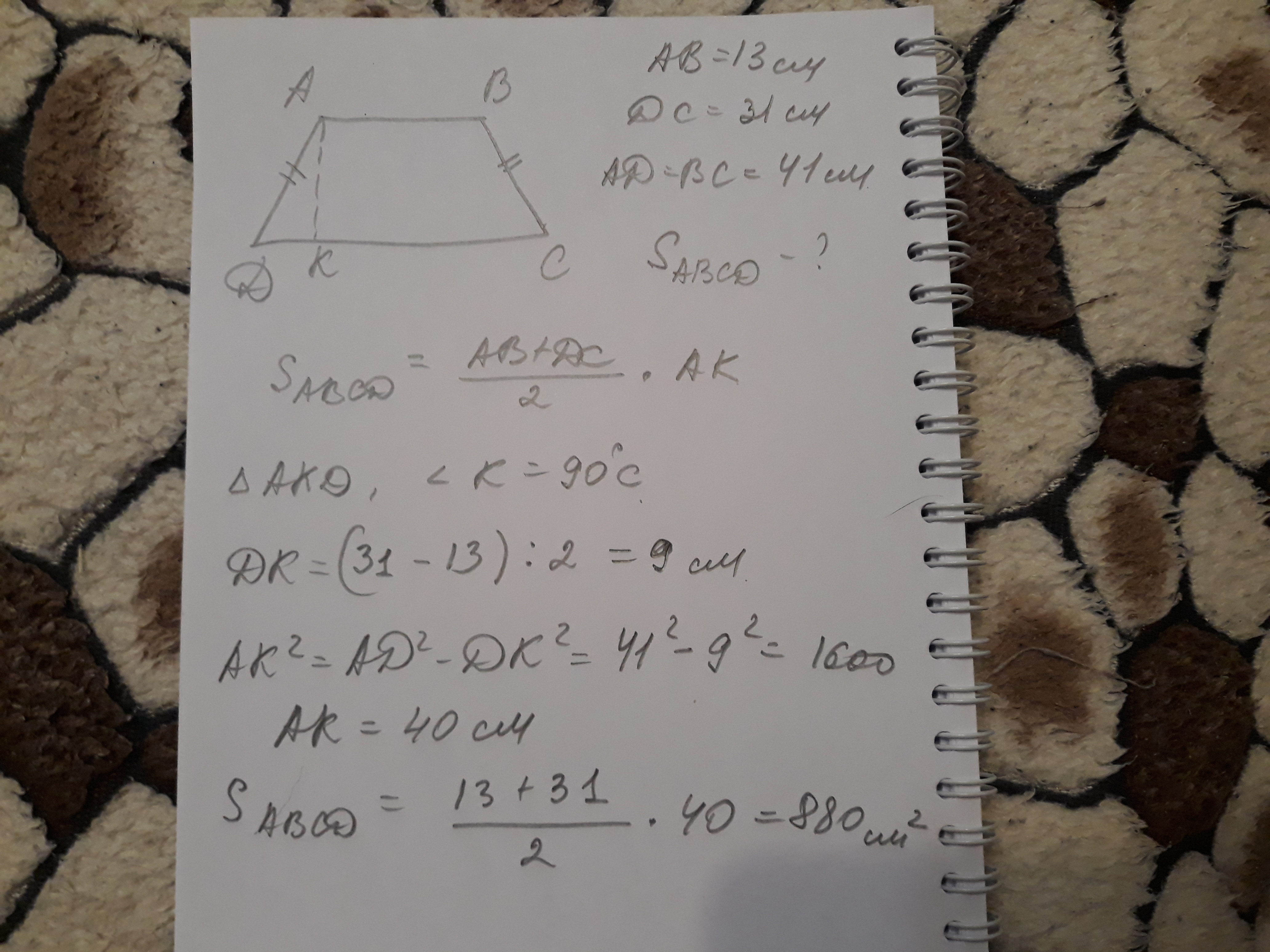 Основания равнобедренной трапеции равны 13 см и 31 см, а боковая сторона 41 см. Найди плошадь трапеции.