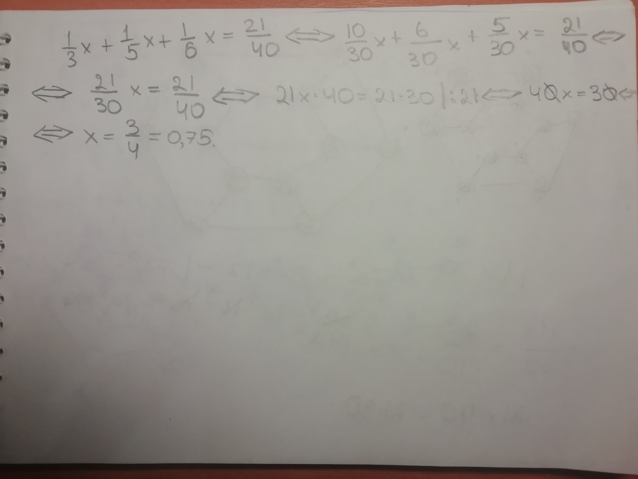 Пошаговое объяснение: 1/3x+1/5x+1/6x=21/40⇔10/30x+6/30x+5/30x=21/40⇔21/30x=21/40⇔21x/30=21/40⇔(по правилу пропорции)21x*40=21*30⇔(делим обе части на 21)⇔40x=30⇔x=3/4