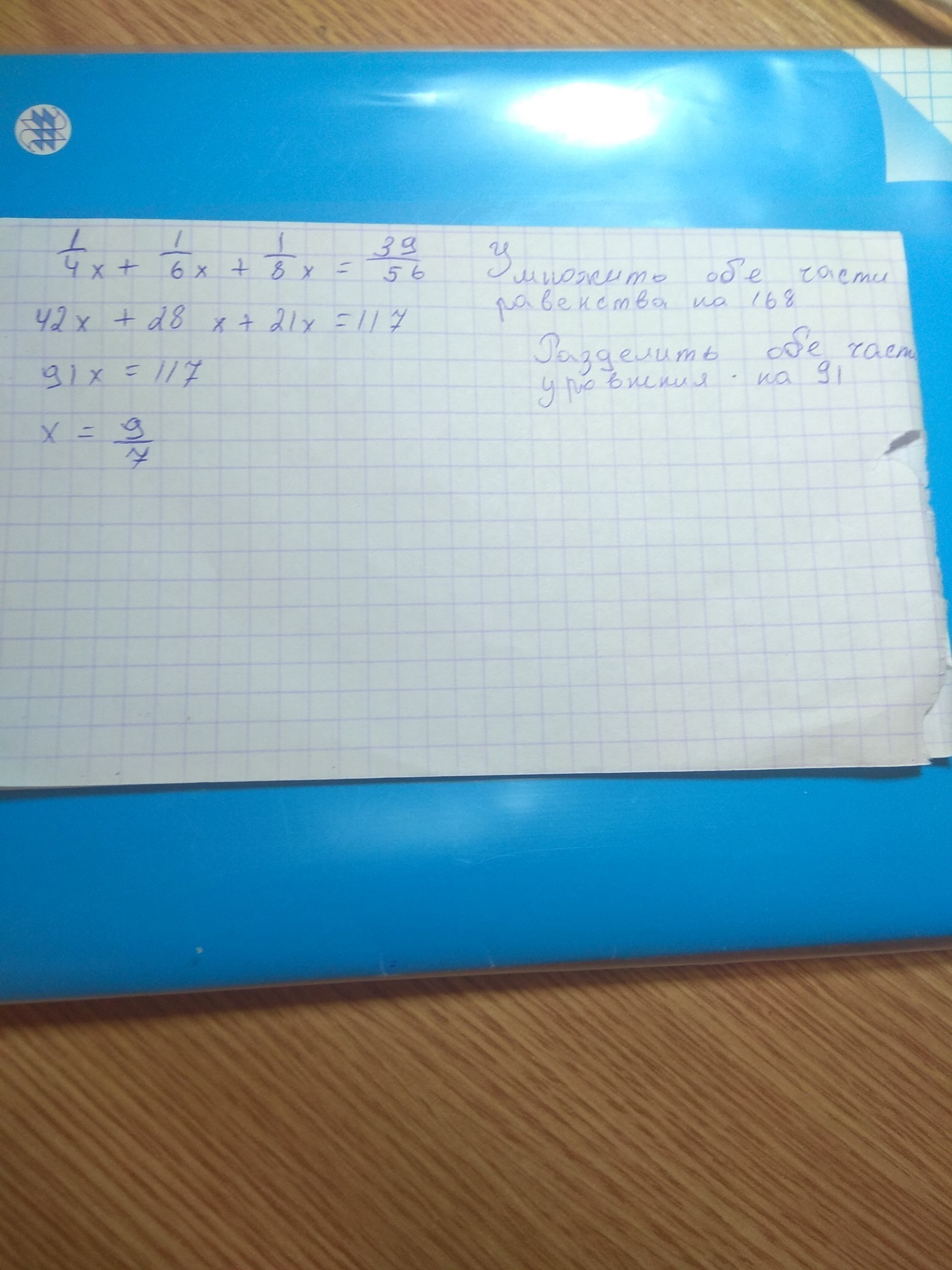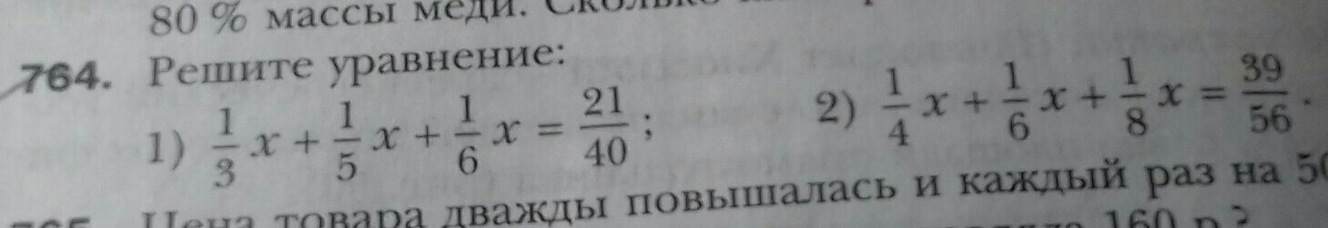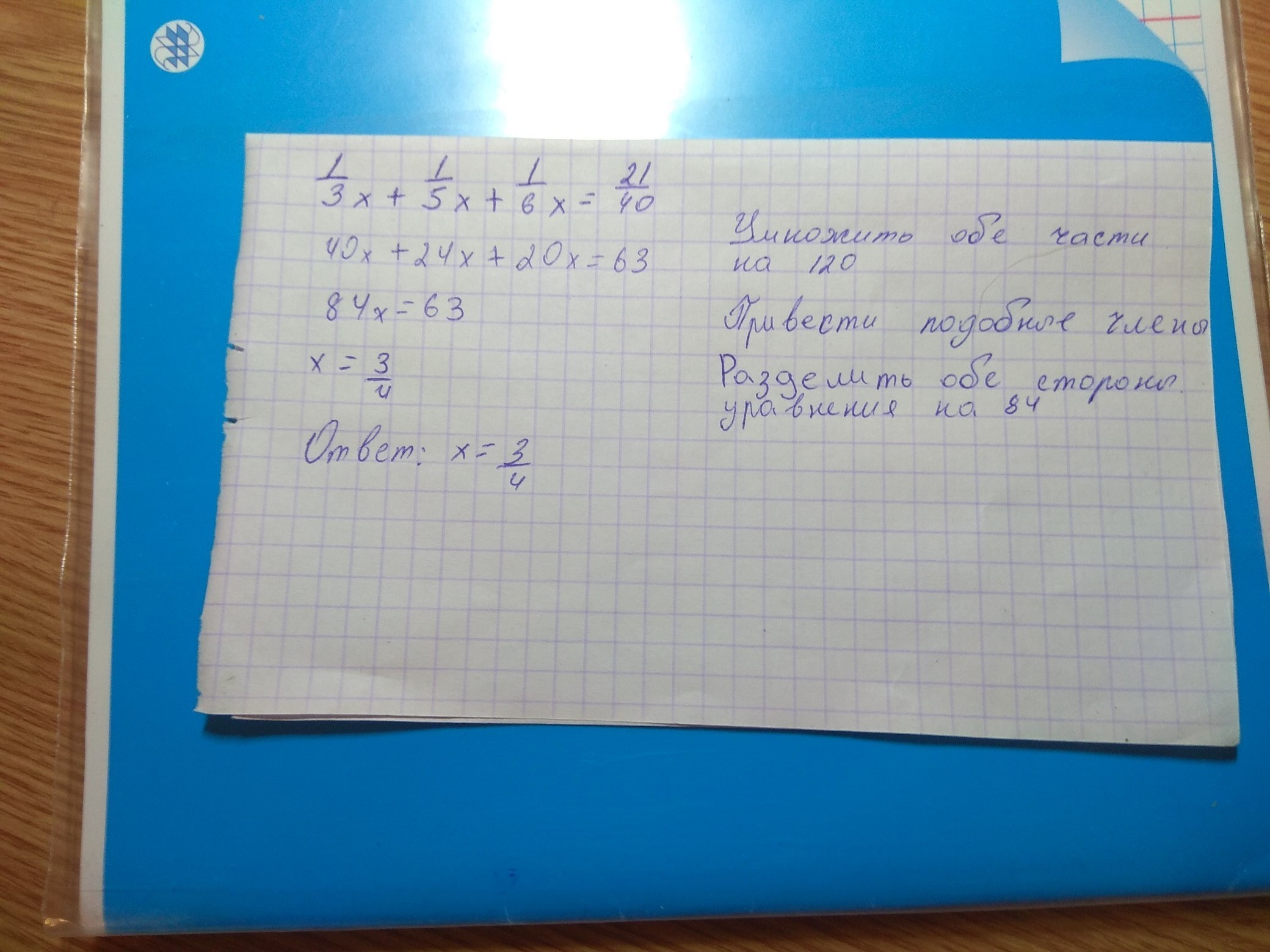 "1. 1/3×+1/5х+1/6х =21/40 ..... 10/30×+6/30×+5/30×=21/40.... 31/30×=21/40 ...... х=21*30/40*21 =3/4 это первое уравнение"