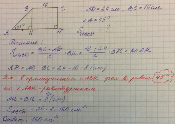 4. Рассмотрим треугольник АВН Угол Н=90. Угол А = 60 град. Тогда угол В=90 - 60 =30 Значит АН = 8 : 2 = 4 (см) (св-во катета лежащего против угла 30 градусов) Тогда АН=АD=4 см. АD = 4 +4 =8см. ВС=НD=4см По теор. Пифагора ВН^2=АВ^2 - АН^2, ВН^2=8^2 - 4^2=64-16=48. ВН=4*корень из 3. Тогда площадь трапеции равна (ВС + АD)/2 * ВН (4 + 8) : 2 * 4*корень из 3 = 24корня из 3 Ответ: 24корня из 3