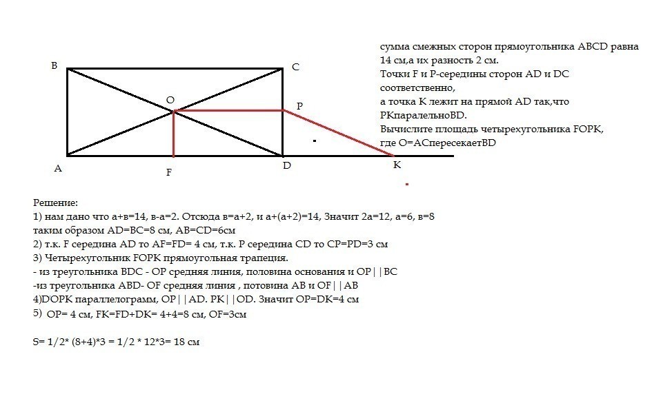 сумма смежных сторон прямоугольника ABCD равна 14 см,а их разность 2 см.Точки F и P-середины сторон AD и DC соответственно,а точка K лежит на прямой AD так,что PKпаралельноBD.Вычислите площадь четырехугольника FOPK,где O=ACпересекаетBD