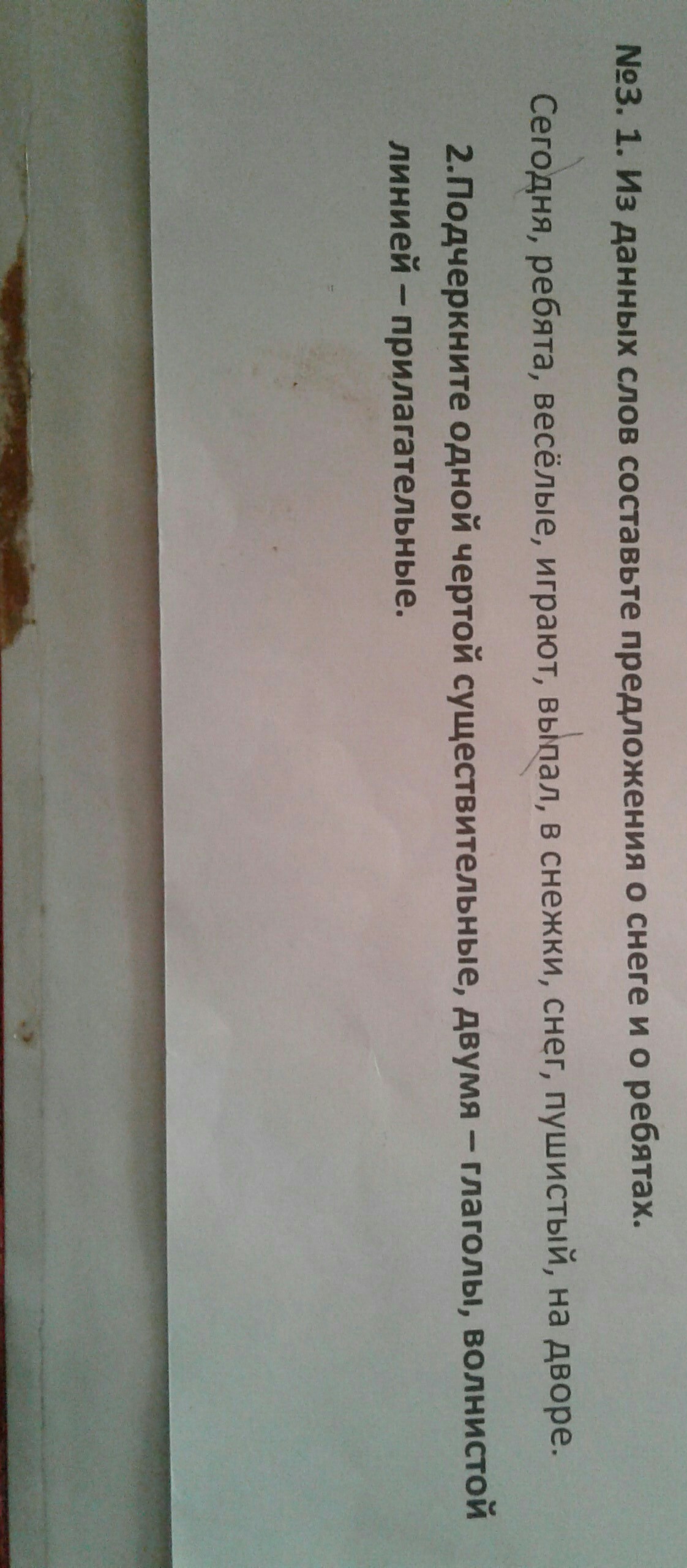 Сегодня выпал(=====) пушистый(~~~~~~) снег(_____).На дворе весёлые(~~~~~~) ребята(_____) играют(======) в снежки.