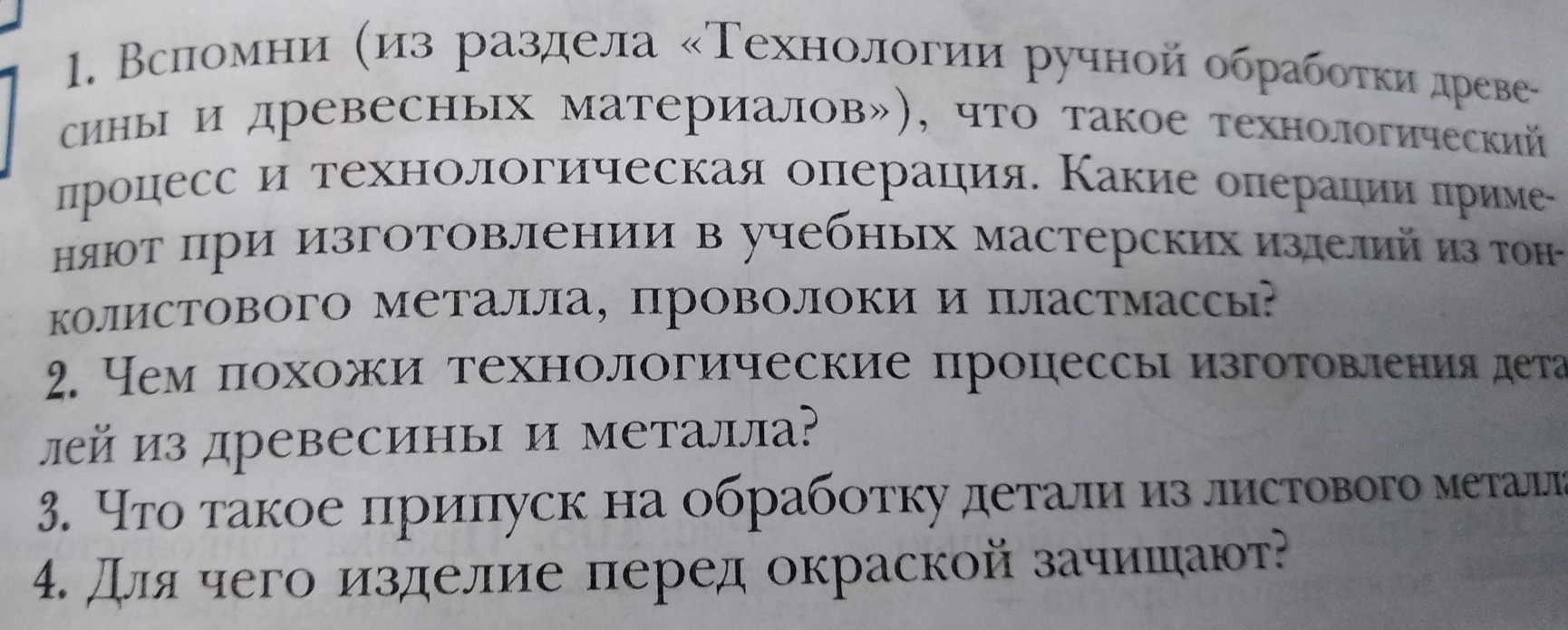 1. Технологический процесс - это это часть производственного процесса, в который входят действия по изменению конструкционного материала или его состояния. Технологическая операция - это законченная часть технологического процесса, выполняемая на одном рабочем месте одним или несколькими рабочими, одних и тех же обрабатываемых изделий, одними и теми же средствами производства. В ходе технологической операции обязательно изменяется – форма, размеры, свойства предмета труда. При изготовлении изделий из тонколистового металла, проволоки и пластмассы применяют следующие технологические операции: разметка, резание, гибка, опиливание, шлифование, окрашивание и др. 2. Технологические операции при обработке древесины и металла имеют следующие сходства: и в том и в другом случае есть операция разметки заготовки, резание, шлифование, окрашивание, точение и т.д. 3. Припуск - слой материала, подвергаемый снятию с заготовки при механической обработке. Припуск назначается в целях обеспечения точности действительных размеров, а также заданного качества поверхностного слоя обработанной детали. 4. Изделие перед окрашиванием зачищают для того, что бы нормально впитывалась или ложились слои краски для прочности лакового или красочного покрытия.