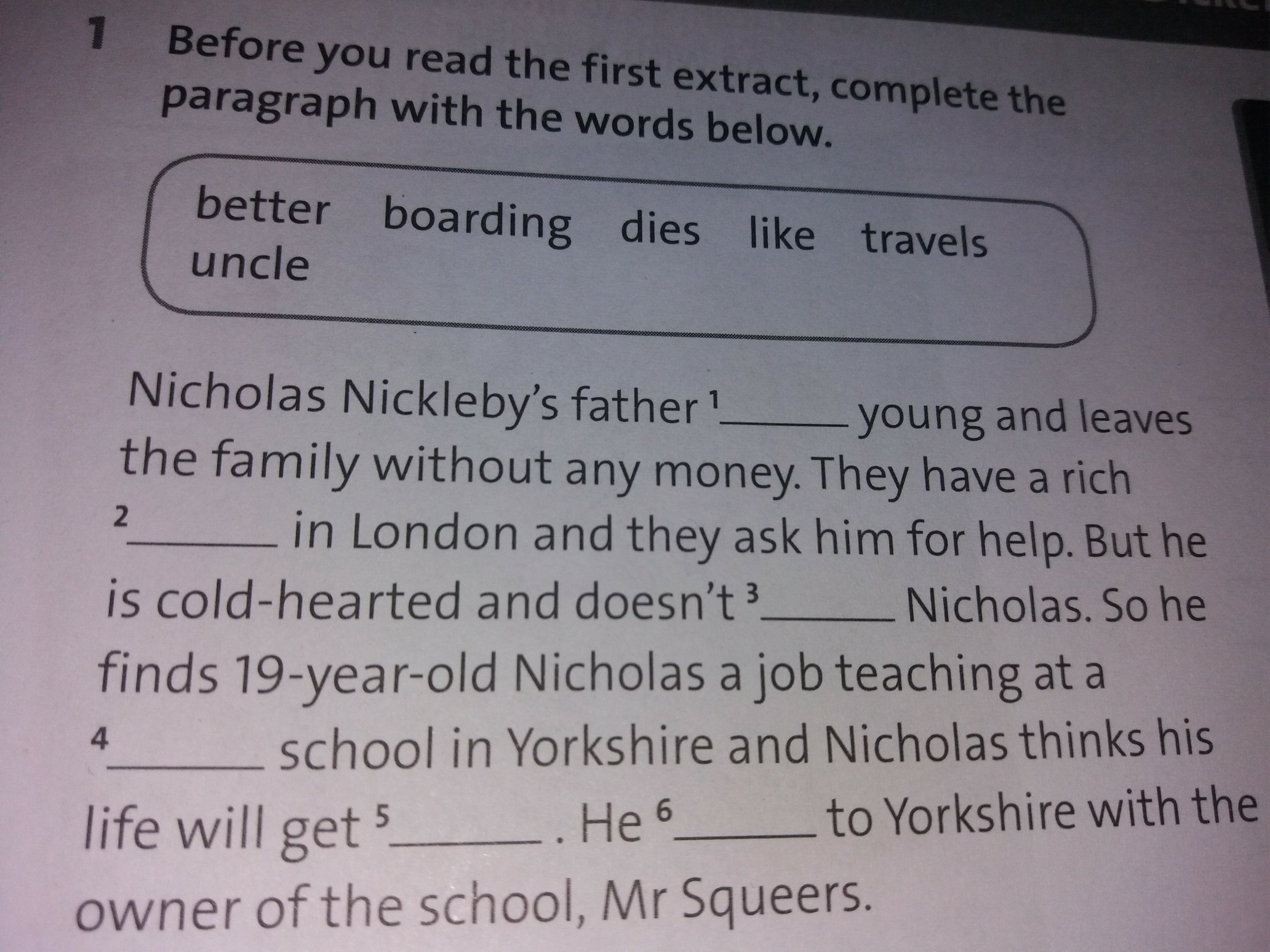 1 dies 2 uncle 3 like 4 boarding 5 better 6 travels