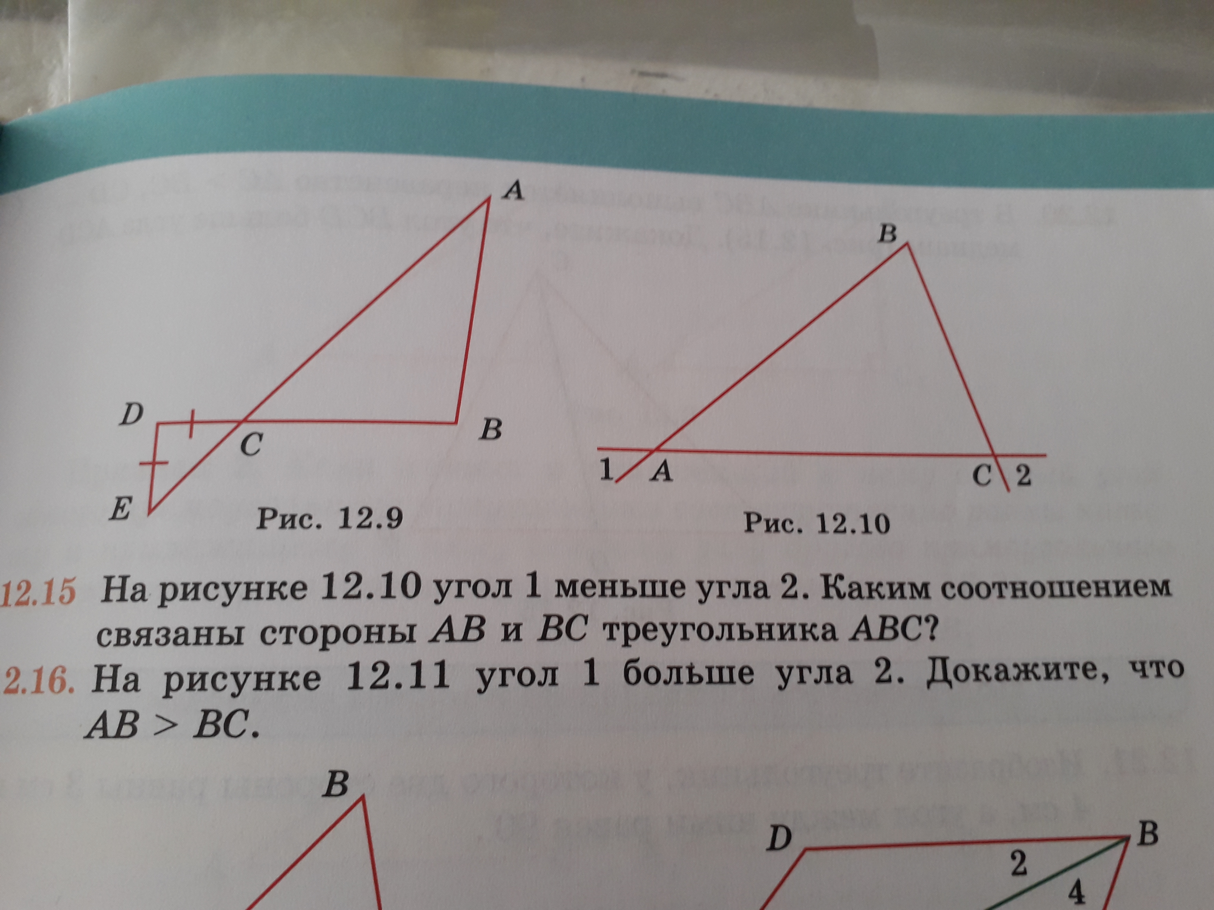 уВАС=у1, уВСА=у2 как вертикальные, значит по условию уВАС<уВСА, а против меньшего угла лежит меньшая сторона, значит ВС<АВ