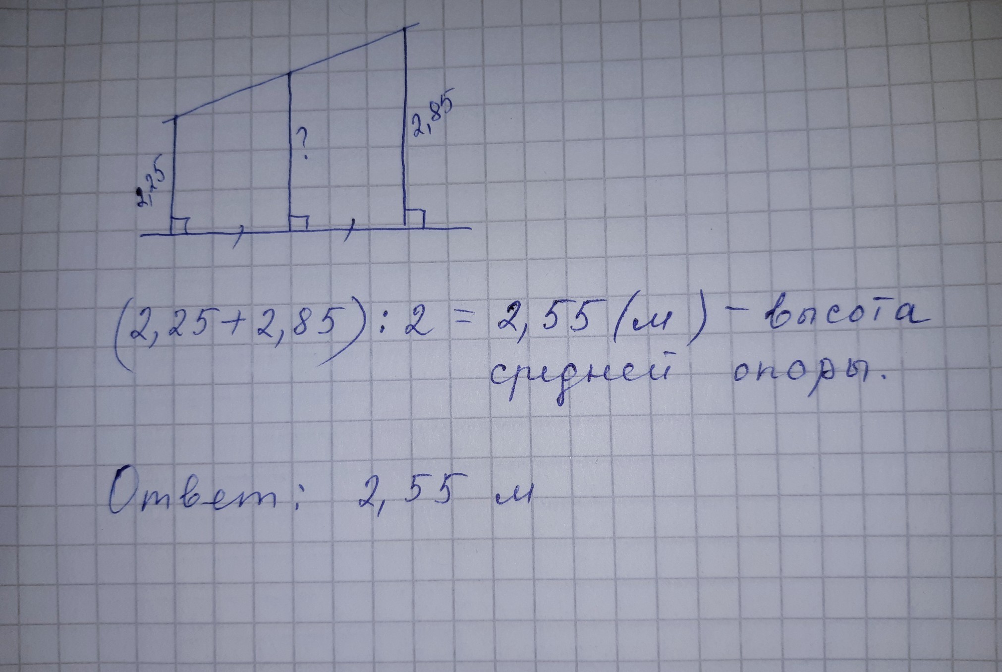 наклонная крыша установлена на трех вертикальных опорах,расположенных на одной прямой,средняя опора стоит посередине между малой и большой опорами...высота малой опоры 2.25м высота большей опоры 2.85м...найдите высоту средней опоры