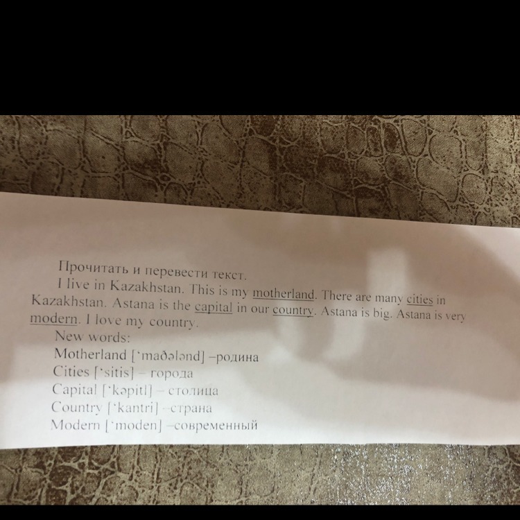 я живу в Казахстане. Это моя родина. в Казахстане есть много городов. Астана столица Казахстана. Астана большая. Астана действительно современная. Я люблю свою страну.
