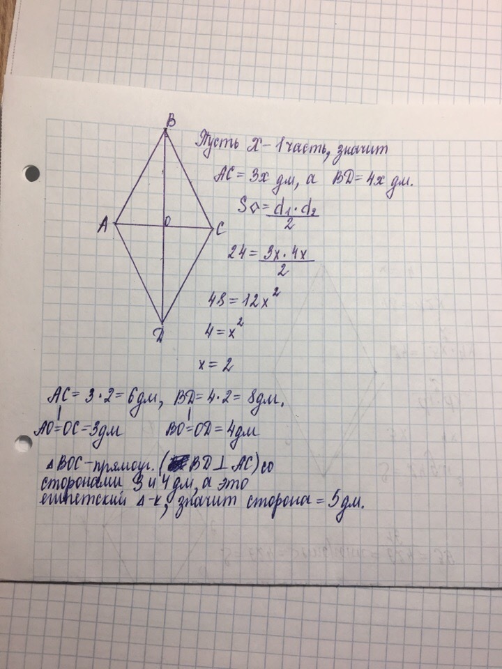 Я надеюсь, что решила всё верно (могу ошибиться в счёте). Сторону можно, конечно, найти через теорему Пифагора, но это египетский треугольник, поэтому сразу понятно, что сторона 5.