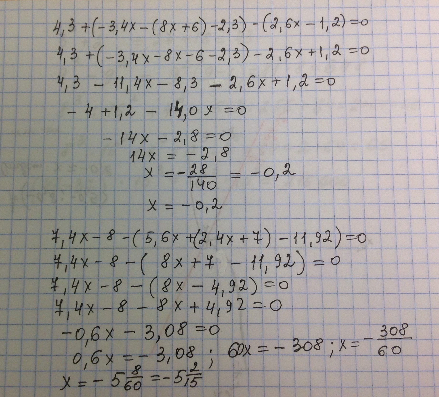 а) 4,3+(-3,4x-(8x+6)-2,3)-(2,6x-1,2)
