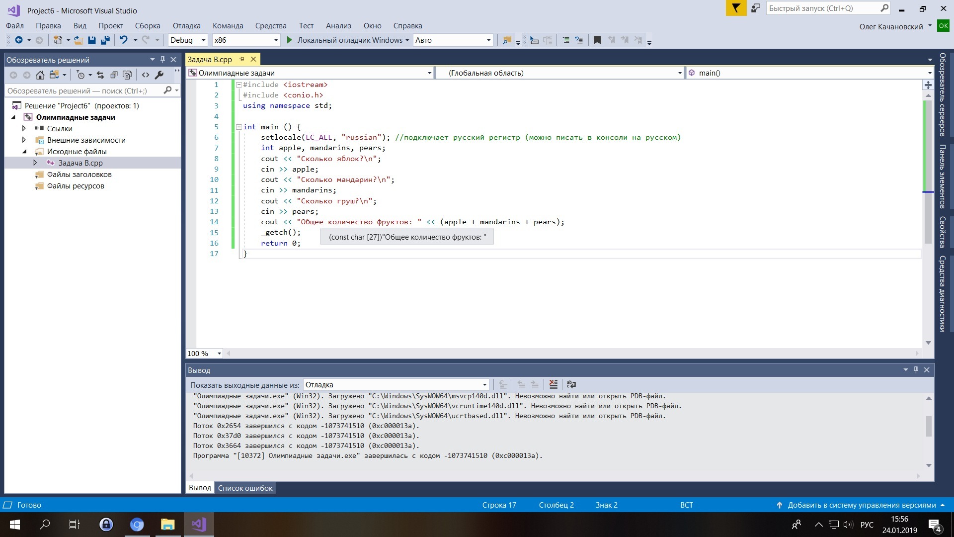cout << "Общее количество фруктов: " << (apple + mandarins + pears);