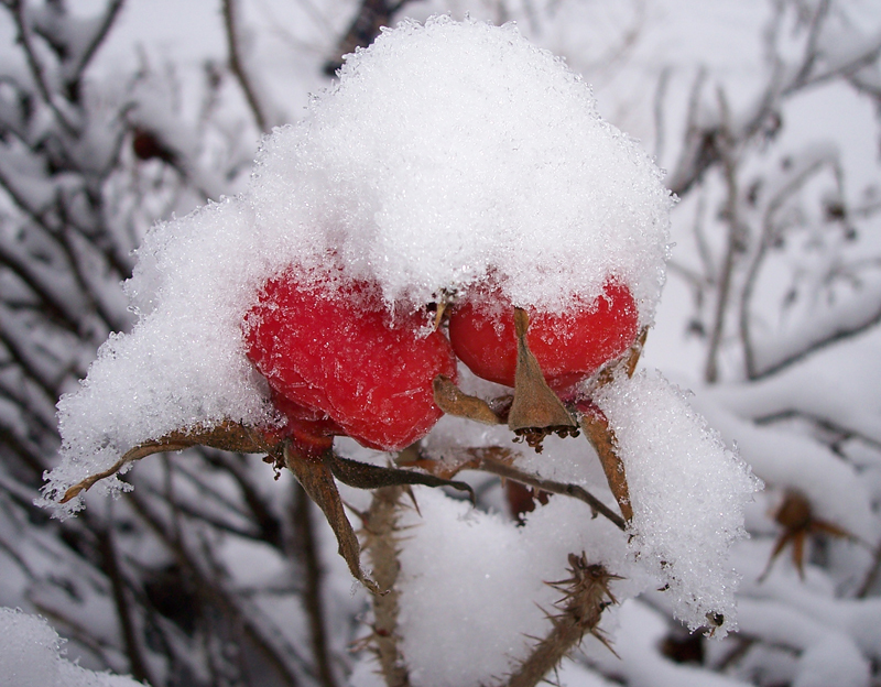 Шиповник .Шиповник он очень красивый красный ,он груглый его можно добавлять в чай и он очень вкусный и полезный,а зимой его покрывает снег