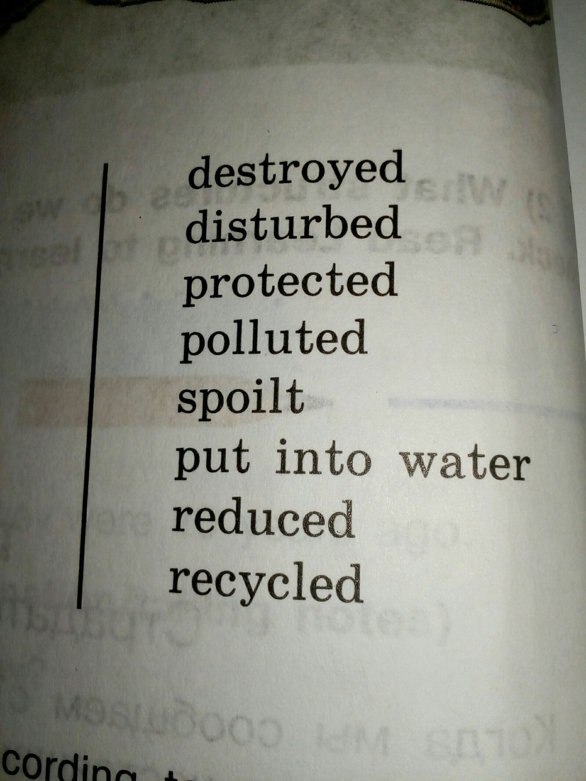 Разрушенный, потревоженный, защищённый, загрязнённый, испорченный, брошенный в воду, уменьшенный, переработанный