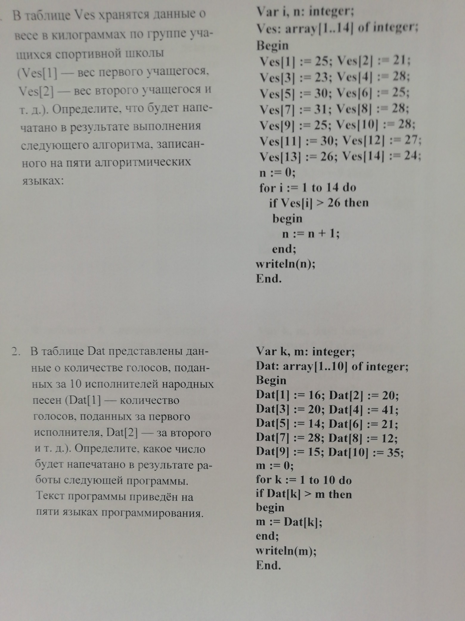 1} Программа подсчитывает количество элементов таблицы Ves, больших 26. Таких элементов 7. Будет напечатано: