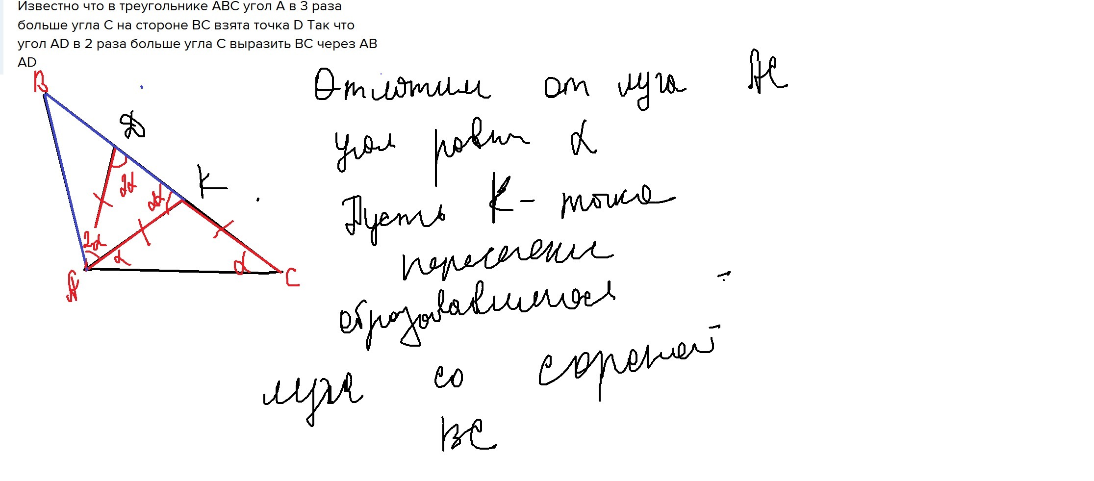 Известно, что в треугольнике ABC угол А в 3 раза больше угла C на стороне BC взята точка D Так, что Угол ADC в 2 раза больше угла C. Выразить BC через AB и AD