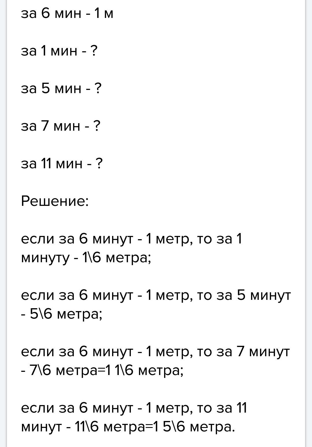 Пошаговое объяснение:1) 1 : 6 = 16 (метра) - за 1 минуту