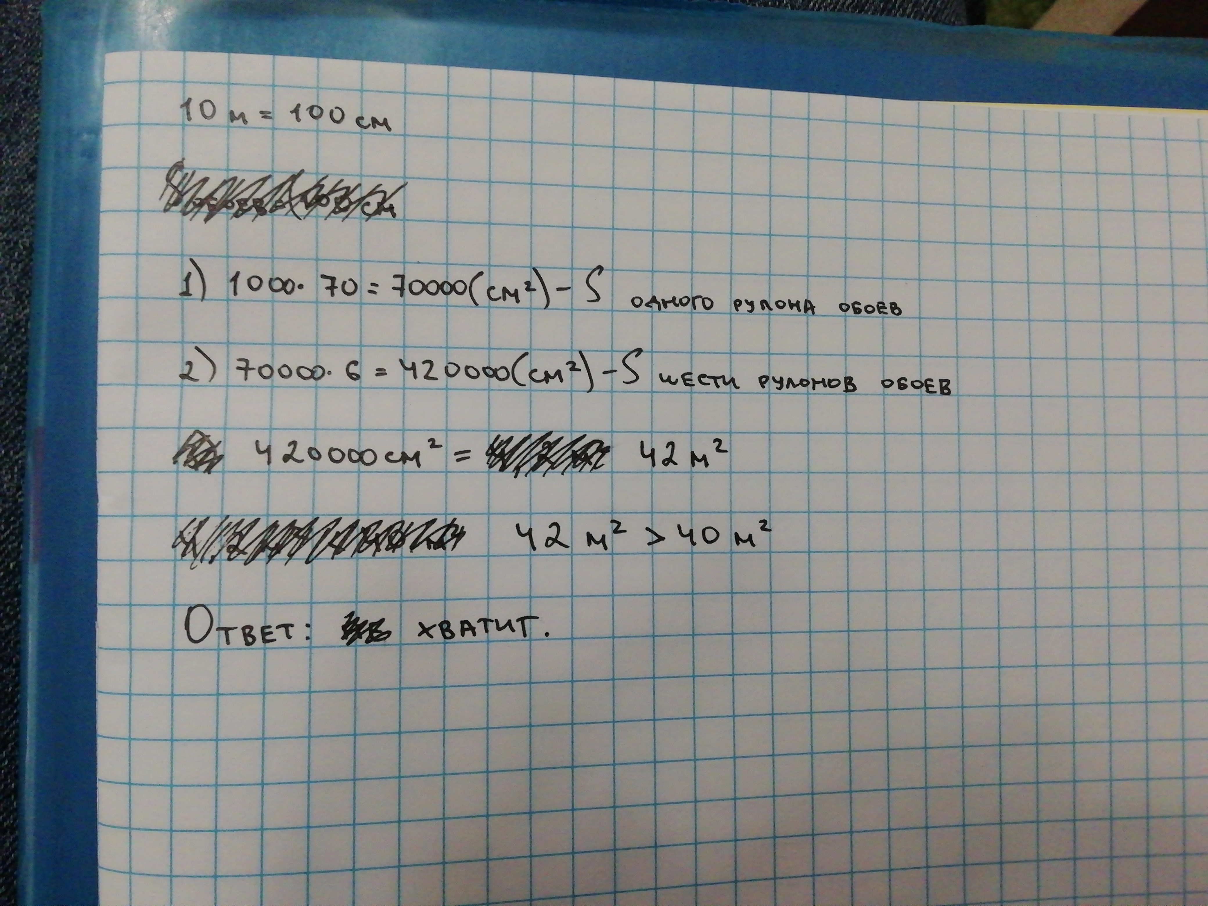 хватит ли шести рулонов обоев длиной 10 м и шириной 70 см, чтобы оклеить ими комнату, площадь стен которой 40 м²?