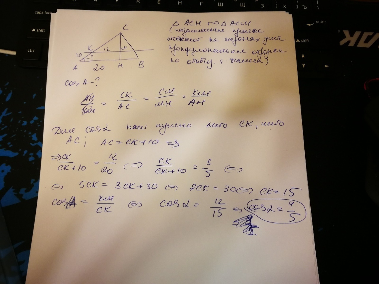 В треугольнике ABC прямая ,параллельная стороне АВ ,пересекает высоту СН в точке М и сторону AC в точке К. найдите косинус угла А, если MK=12, АH= 20, АК = 10