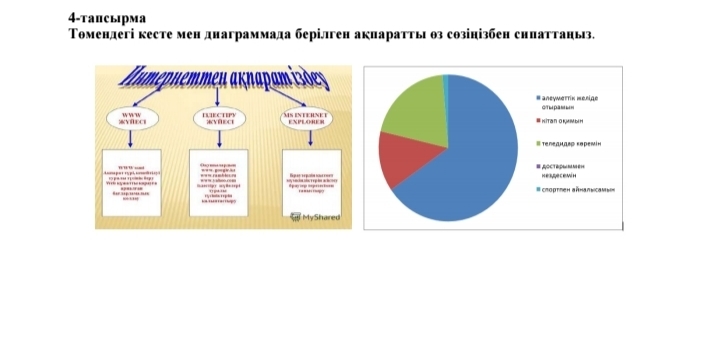 Бұл диаграмма менің қалай уақыт өткізетіндігім туралы жазылған. Көріп тұрғаныңыздай ең көбі көк түспен боялған, ол әлеуметтік желінде уақыт өткізу. Келесі жасыл түспен көрсетілген ол теледидар көру. Үшінші орында қызыл түс алынып түр ол кітап оқу. Сосын ашық көк түспен боялған жерде спортпен айналысу көрсетілген.