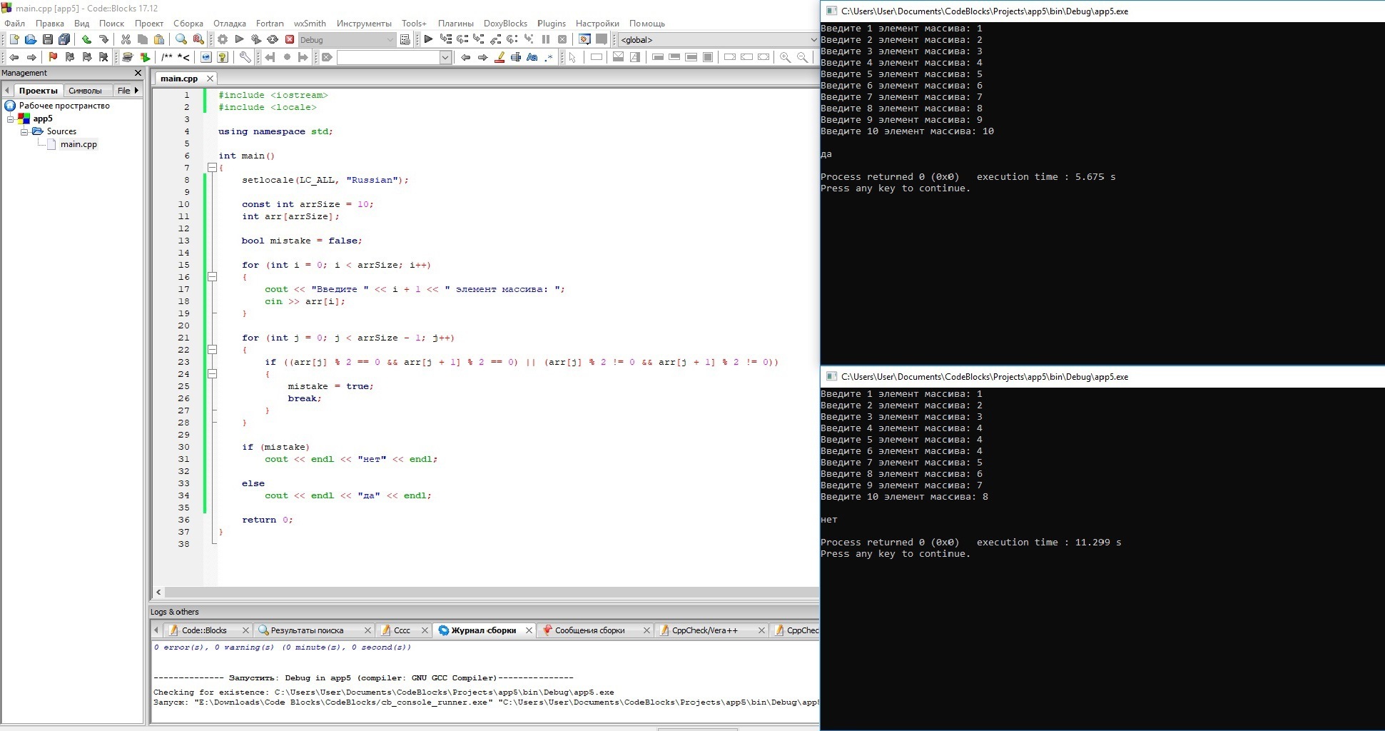 C++. Вводится целочисленный массив. Программа выводит "да" если чётные и нечётные чередуются, и "нет" в противоположном случае.