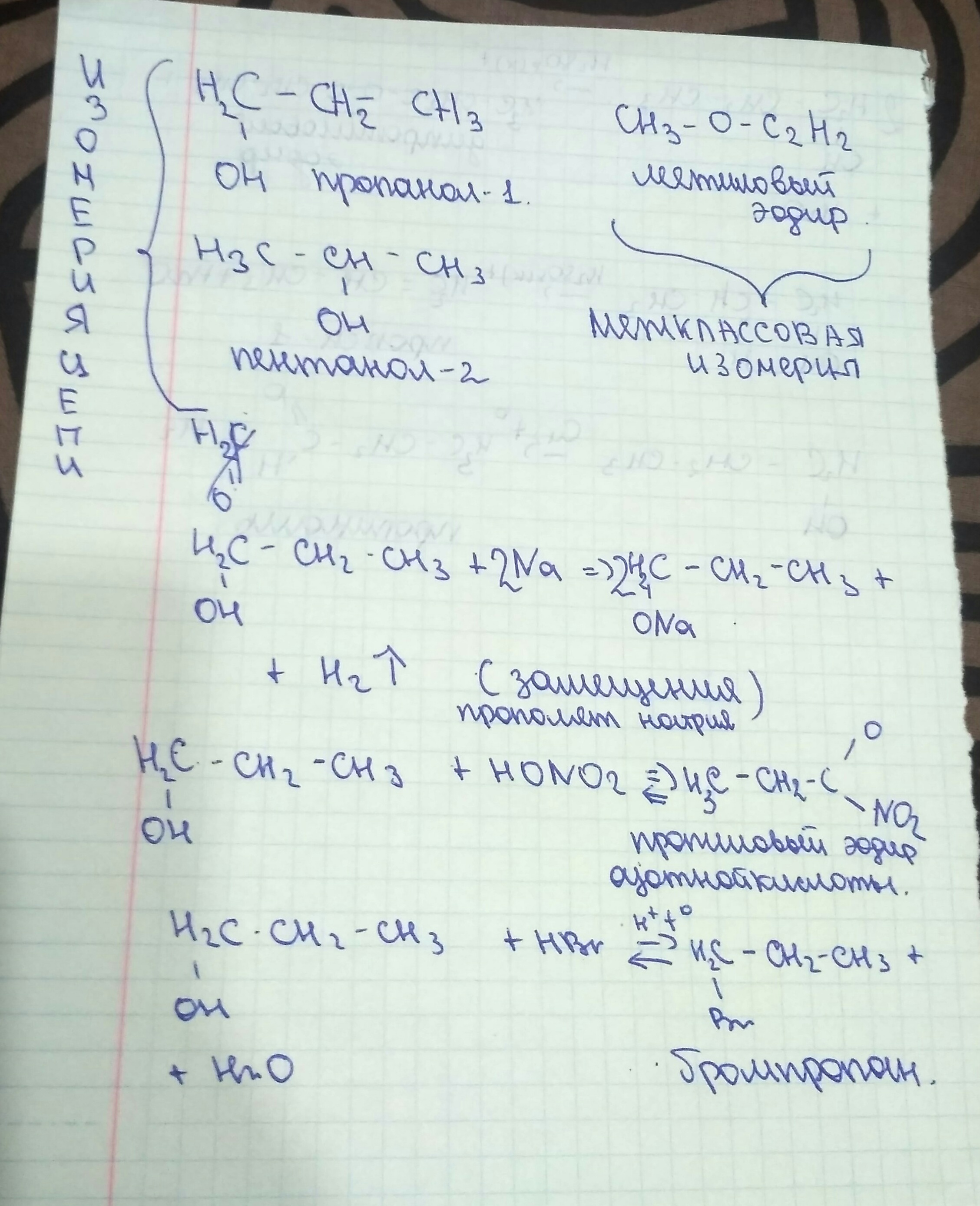 на каждый вид изомерии для пентанола -1 напишите по одному изомеру и назовите их, для пропанола напишите уравнения характерных реакций
