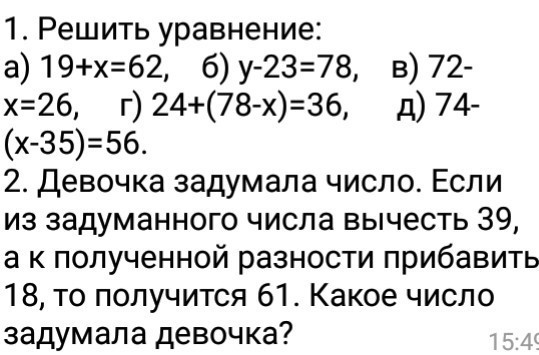 а)19+х=62 б)у-23=78 в) 72-х=26