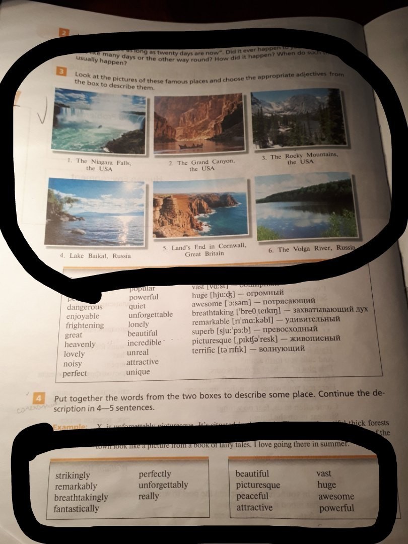 Нужно описать пятью предложениями одно из мест из упражнения 3 прилагательными из упражнения 4