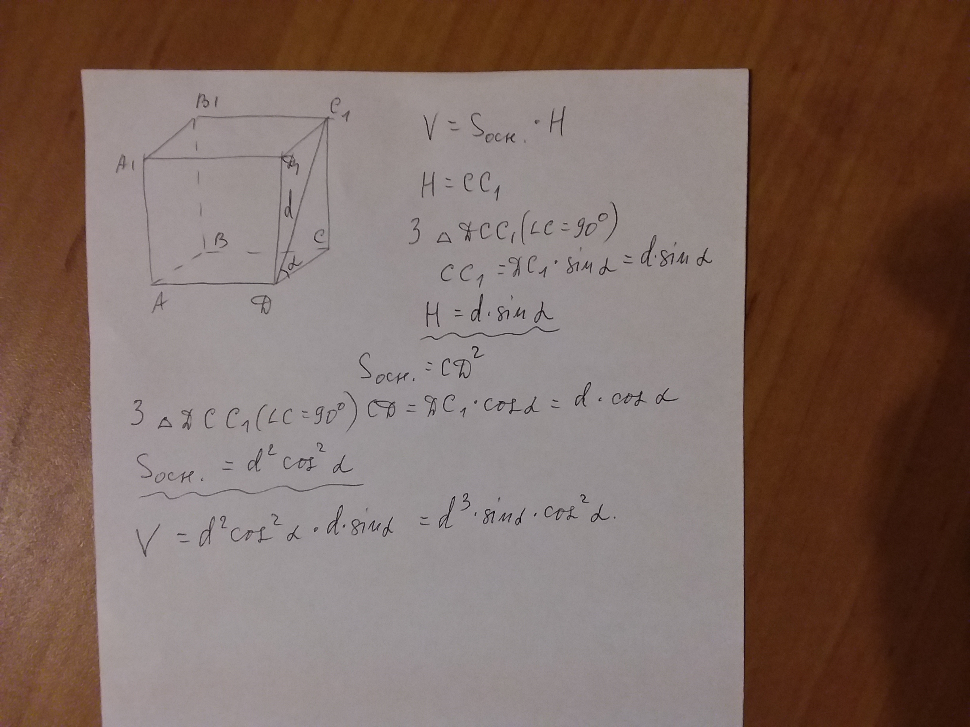 Знайдіть об'єм правильної чотирикутної призми,якщо діагональ бічної грані дорівнює d ,а діагональ призми утворює зі стороною основи кут a(альфа)