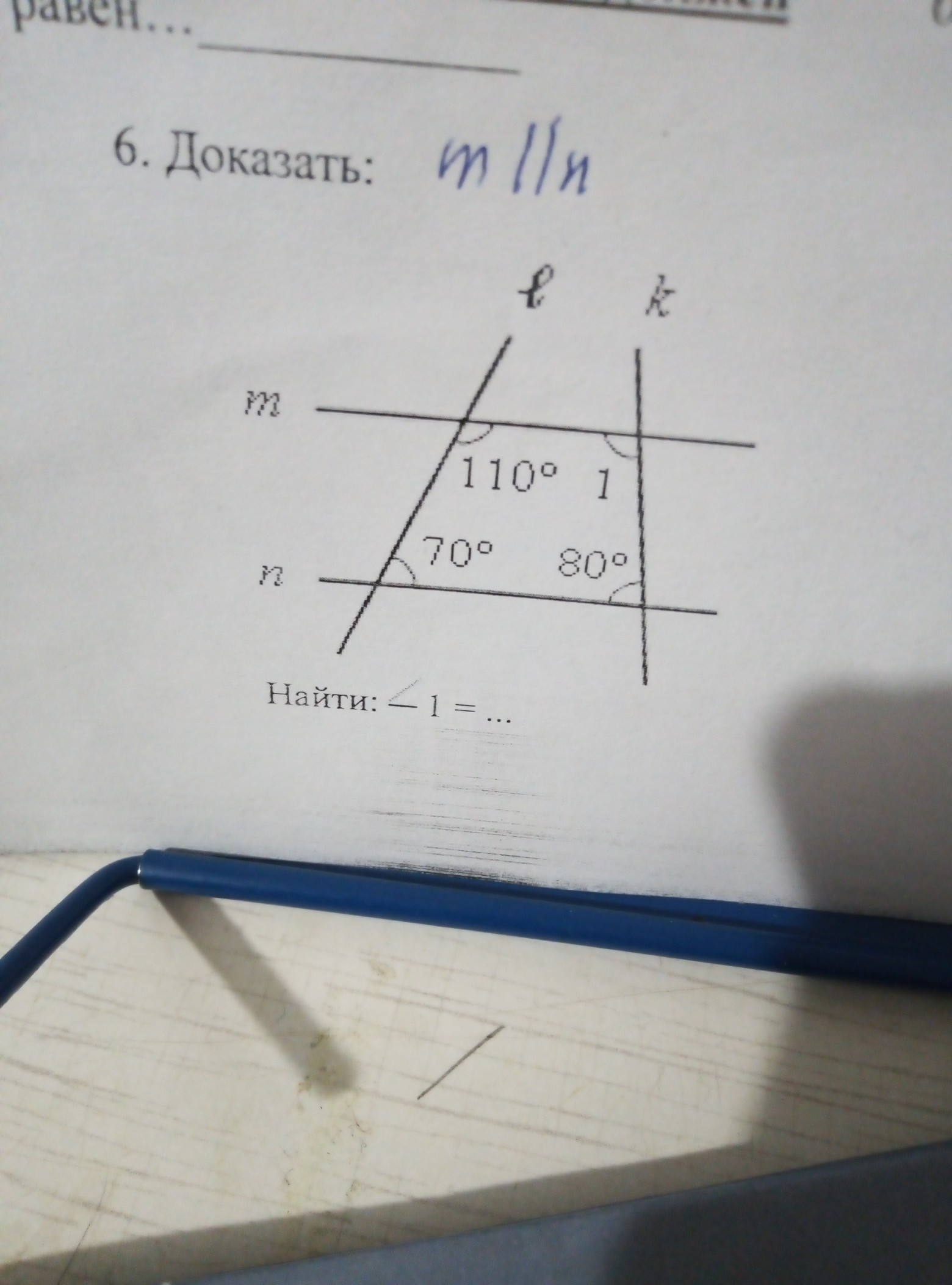 или другой способ: m║n ∠1+110°+70°+80°=360° -> ∠1+260°=360° ->∠1=100°