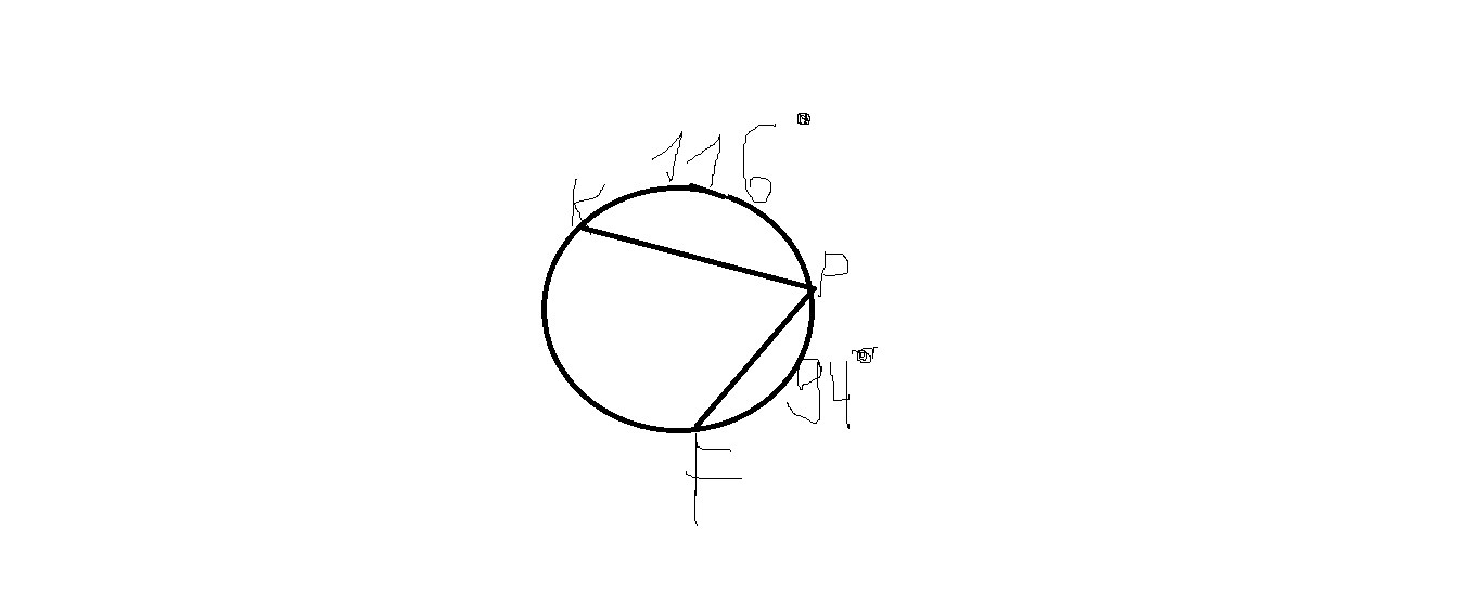Проведем хорду KF. Все углы (KPF, FKP, PKF) - вписанные. следовательно, все они равны половине дуги, на которую опираются. Следовательно, угол KFP=116/2=58, угол PKF = 94/2 =47, а угол KPF можно найти из суммы углов треугольника, т.е. 180=KPF + 47 + 58 => KPF= 180-47-58=75.