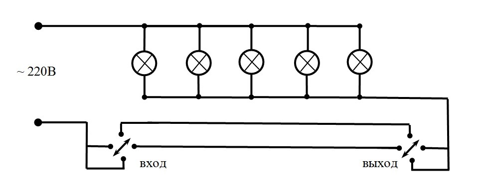 Однако, обе схемы обладают существенным недостатком: лампочка может быть только одна, или их придется включать в цепь последовательно и колдовать с напряжениями и мощностью лампочек, чтобы добиться нормального освещения коридора.