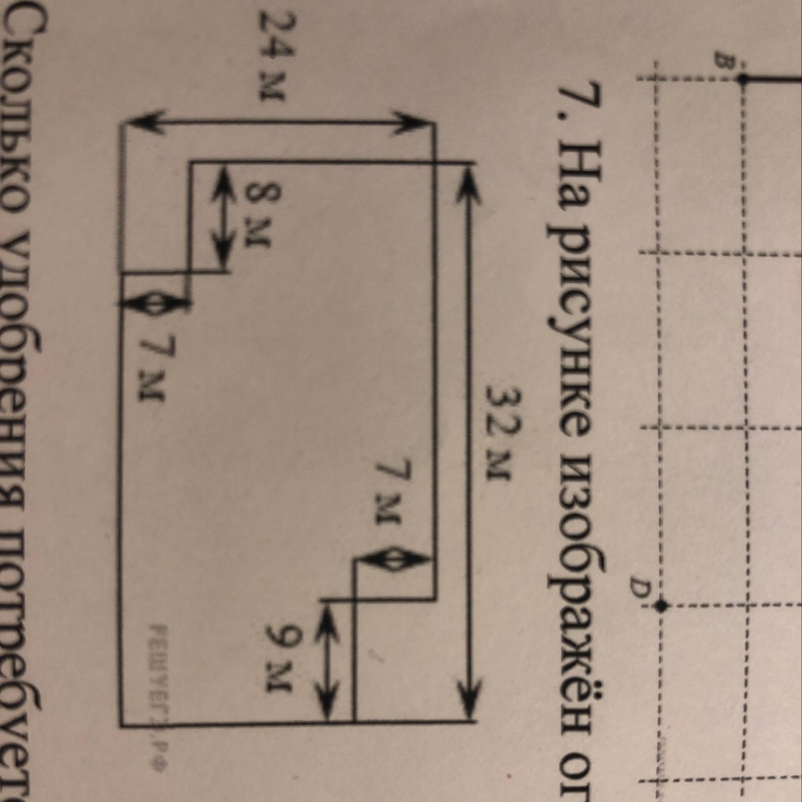 На рисунке изображён огород. На каждый по (100 м2) нужно 6 кг удобрений. Сколько удобрения потребуется на данный участок?