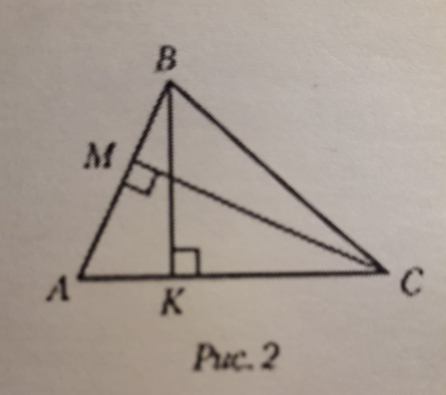 Дан треугольник ABC ( рис. 2). BK = 10см, CM = 8см - высоты треугольника, AC = 24 см. Найдите длину стороны AB.