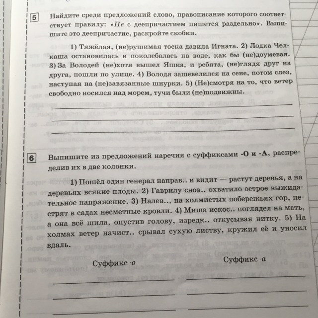 1)Тяжёлая,нерушимая тоска давила Игната.2)Лодка Челкаша остановилась и поколебалась на воде,как бы недоумевая.3)За Володей нехотя вышел Яшка,и ребята,не глядя друг на друга, пошли по улице.4)Володя зашевелился на стене,потом слез, наступая на незавязанные шнурки.5) Несмотря на то,что ветер свободно носился над морем,тучи были неподвижны.