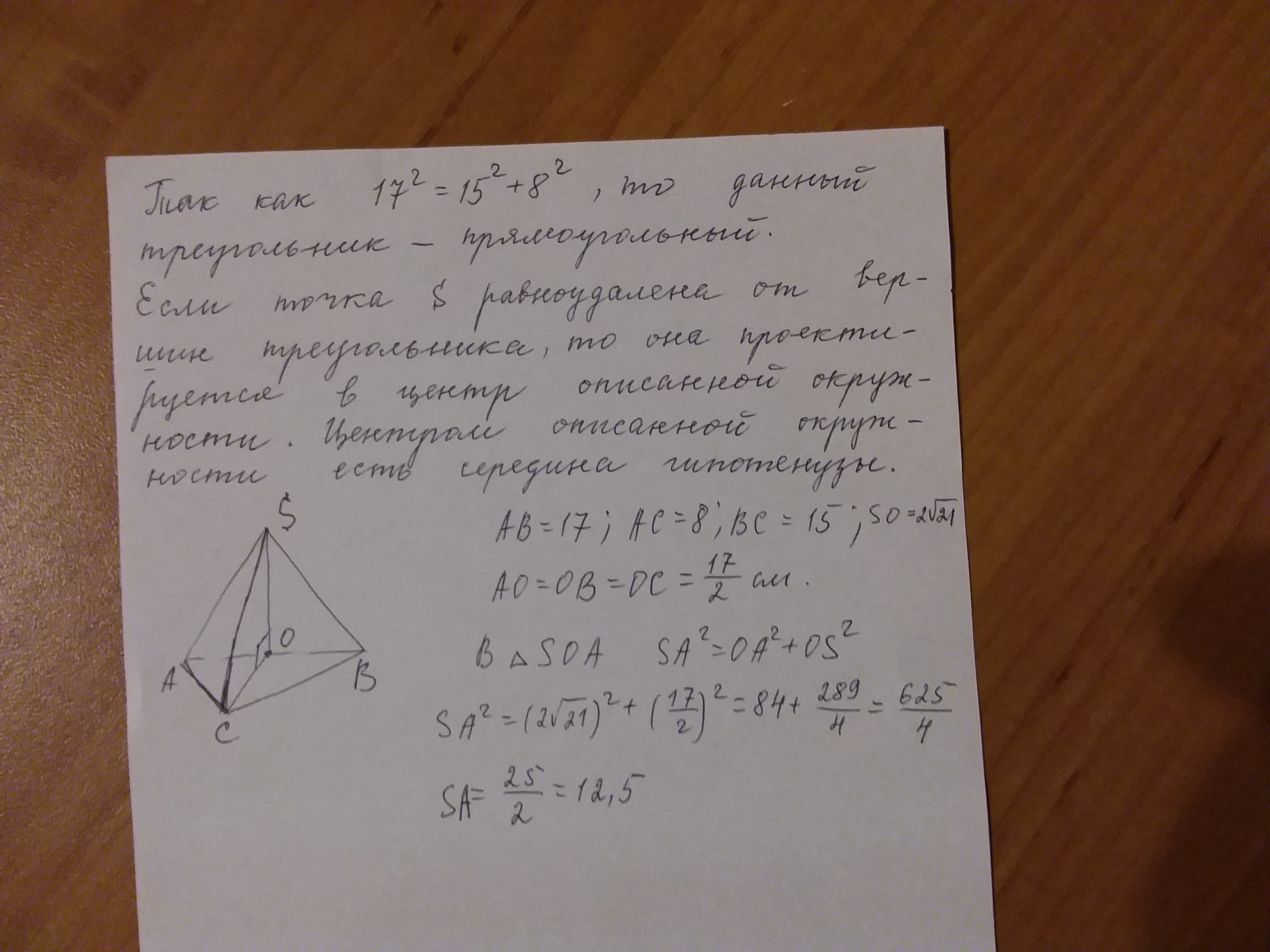 Стороны треугольника равны 8 см, 15см и 17 см. Через точку S которая ровноудалена от вершин треугольника, до его площади проведен перпендикуляр SO. Найдите SA, если