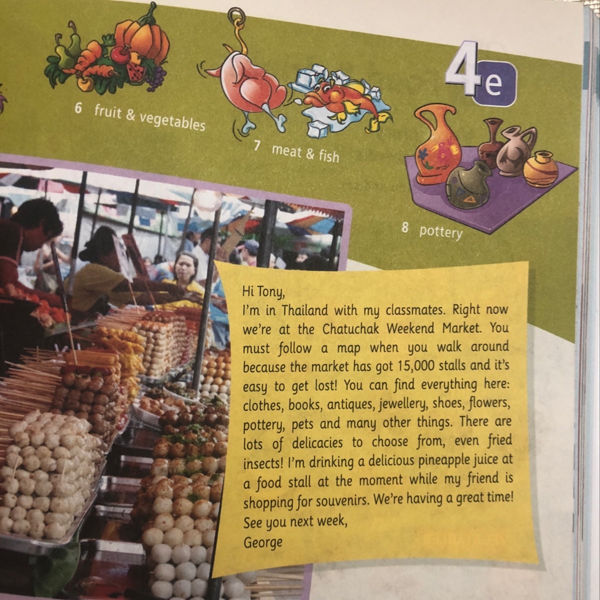 Я нахожусь в Тайланде с моими одноклассниками. Сейчас мы на выходной ярмарке "Чатучак". Ты должен следовать карте, когда гуляешь в округе, потому что здесь 15 тысяч ларьков и тут легко потеряться! Здесь можно найти все: одежду, книги, антиквариат, драгоценности, обувь, цветы, керамику, домашних питомцев и многое другое. Здесь много деликатесов на выбор, даже приготовленные насекомые! Я пью вкусный ананасовый сок в ларьке, где продается еда, в то время как мой друг покупает сувениры. Мы замечательно проводим время!