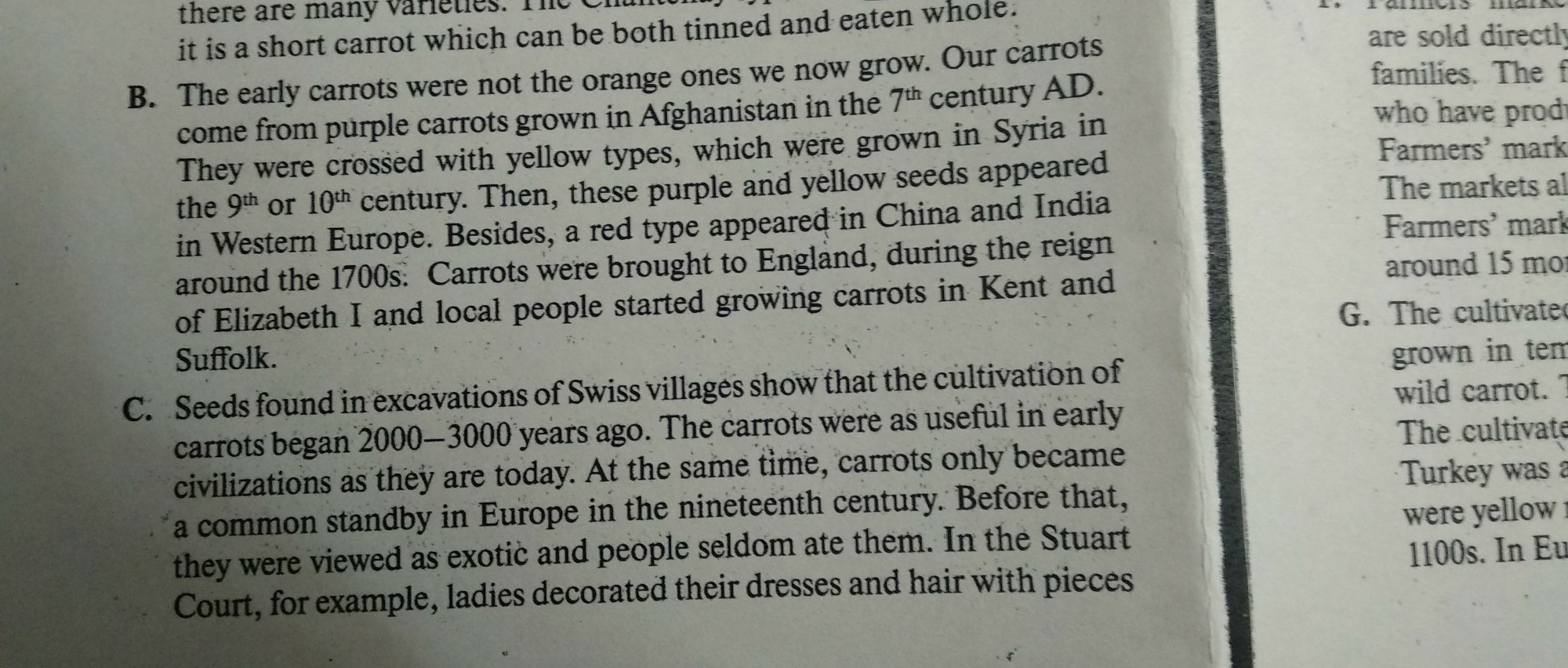 Ранняя морковь не была той оранжевой, которую мы сейчас выращиваем. Наша морковь происходит от фиолетовой моркови, выращенной в Афганистане в 7-м веке нашей эры. Они были скрещены с желтыми сортами, которые были выращены в Сирии в 9-м или 10-м веке. Затем эти фиолетовые и желтые семена появились в Западной Европе. Кроме того, красный тип появился в Китае и Индии около 1700-х годов. Морковь была привезена в Англию, во время правления Елизаветы I, и местные жители начали выращивать морковь в Кенте и Саффолке.