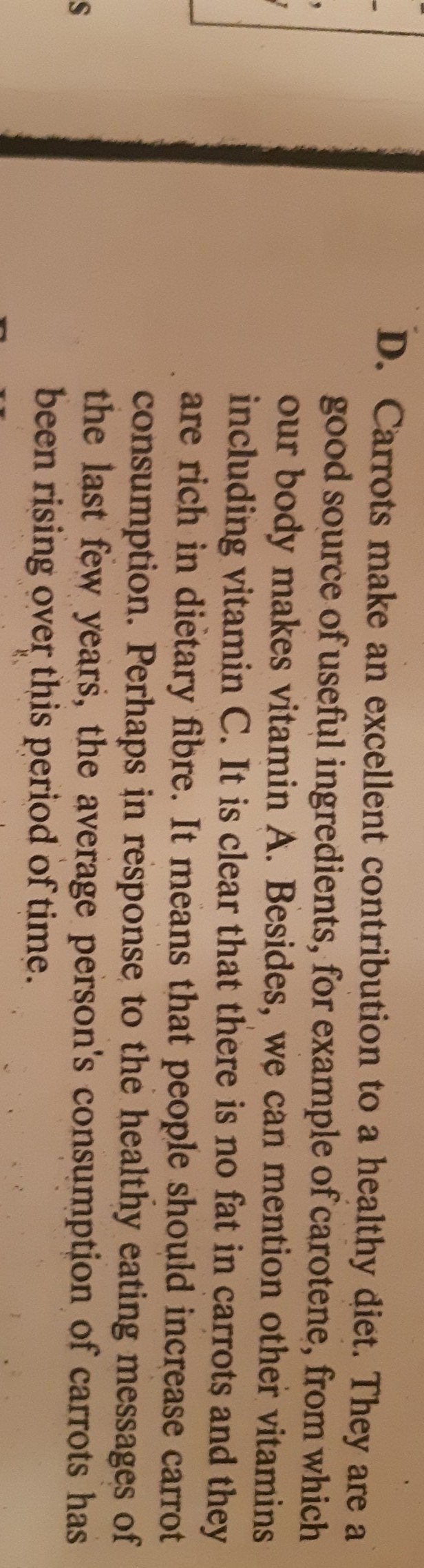D. Морковь вносит отличный вклад в здоровое питание. Они являются хорошим источником полезных ингредиентов, например, каротина, из которого наш организм производит витамин А. Кроме того, мы можем упомянуть другие витамины, включая витамин С. Понятно, что в моркови нет жира, и они богаты клетчаткой. Это означает, что люди должны увеличить потребление моркови. Возможно, в ответ на сообщения о здоровом питании за последние несколько лет, потребление моркови в среднем за этот период увеличилось.