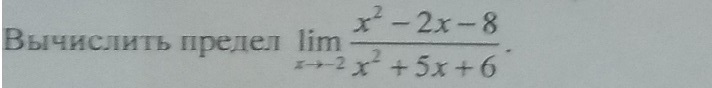 = Lim{x => -2} [(x+2)(x-4)/(x+3)(x+2)] — разложили на множители, используя формулу ax²+bx+c = a(x-x1)(x-x2), где х1 и х2 — корни этого уравнения.