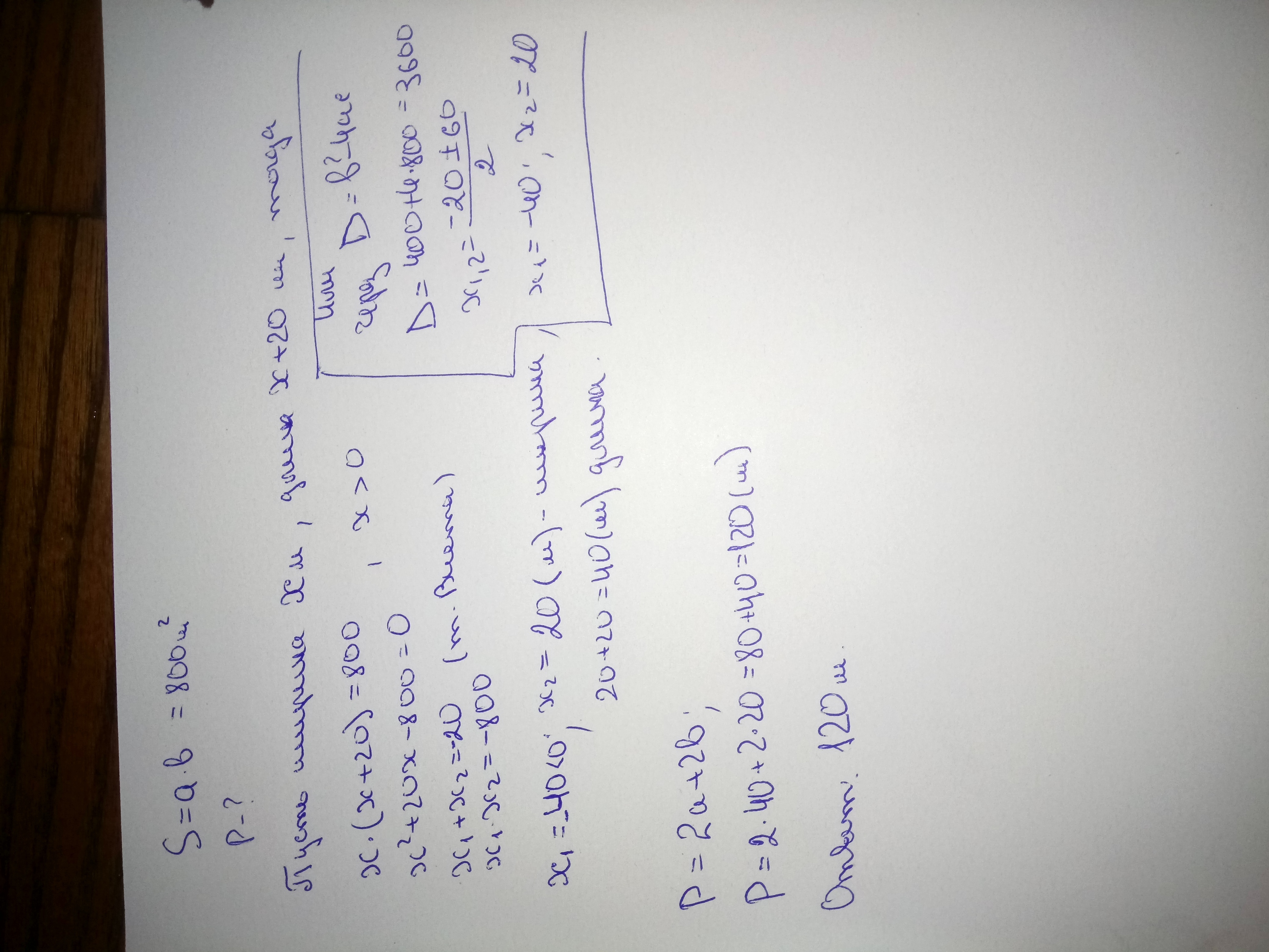 Площадь земельного участка равна 800 метров ^2. Найдите периметр, если длина больше ширины на 20 метров. (Текстовая задача, 8 класс).
