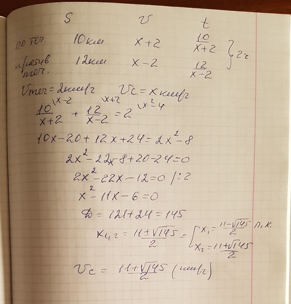 моторная лодка прошла 10 км по течению реки и 12 км против течения, затратив на весь путь 2 часа. найдите скорость течения реки равна 2 км/ч