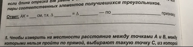 Два отрезка AB и MK длиной 6 см и 7 см соответственно пересекаются в точке O, являющейся серединой этих отрезков. Найдите длину отрезка AK, если длина отрезка BM равна 5 см. Обоснуйте свой ответ. Запишите все первы соответственных элементов получившихся треугольников.
