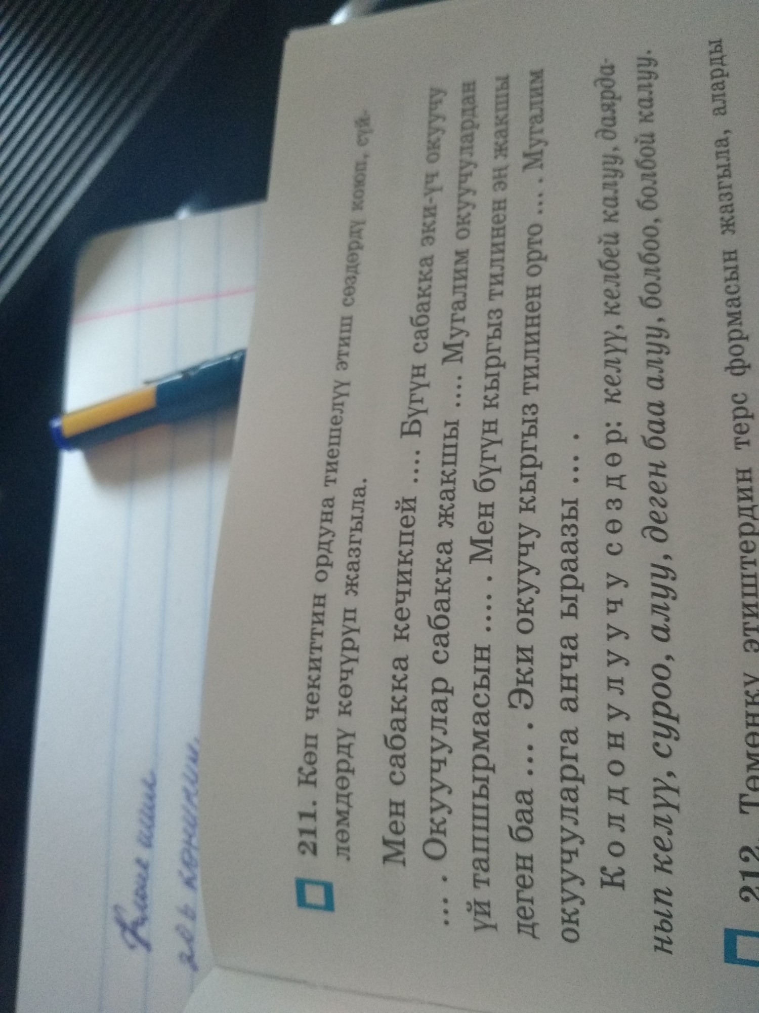 Мен сабакка кечикпей келем. Бугун сабакка эки-уч окуучу келбей калды. Окуучулар сабакка жакшы даярданып келишет. Мугалим окуучулардан уй тапшырмасын сурайт. Мен бугун кыргыз тилинен эн жакшы деген баа алдым. Эки окуучу кыргыз тилинен орто деген баа алды. Мугалим окуучуларга анча ыраазы болбой калды.