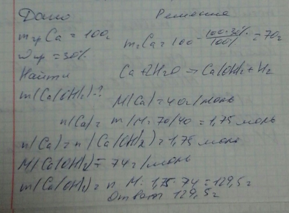 Сколько граммов гидроксида кальция образовалось при взаимодействии 100г кальция, содержащего 30% примесей с водой?