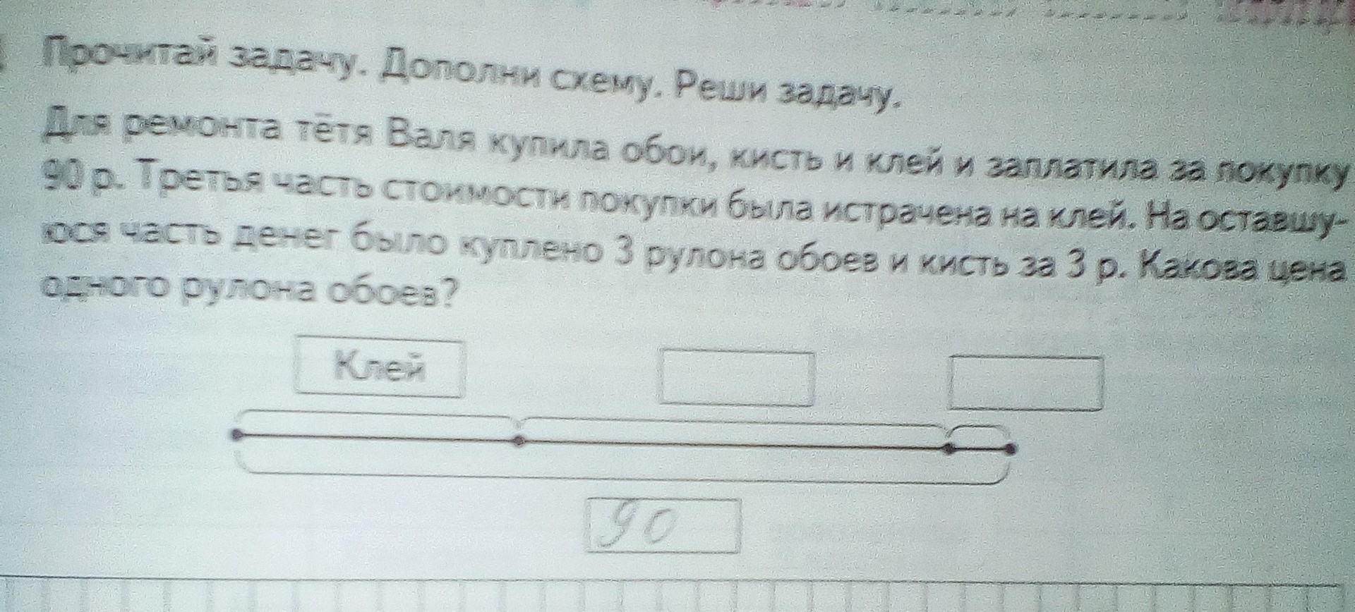 2) 90 - 30 = 60 (руб.) - обои и кисть.