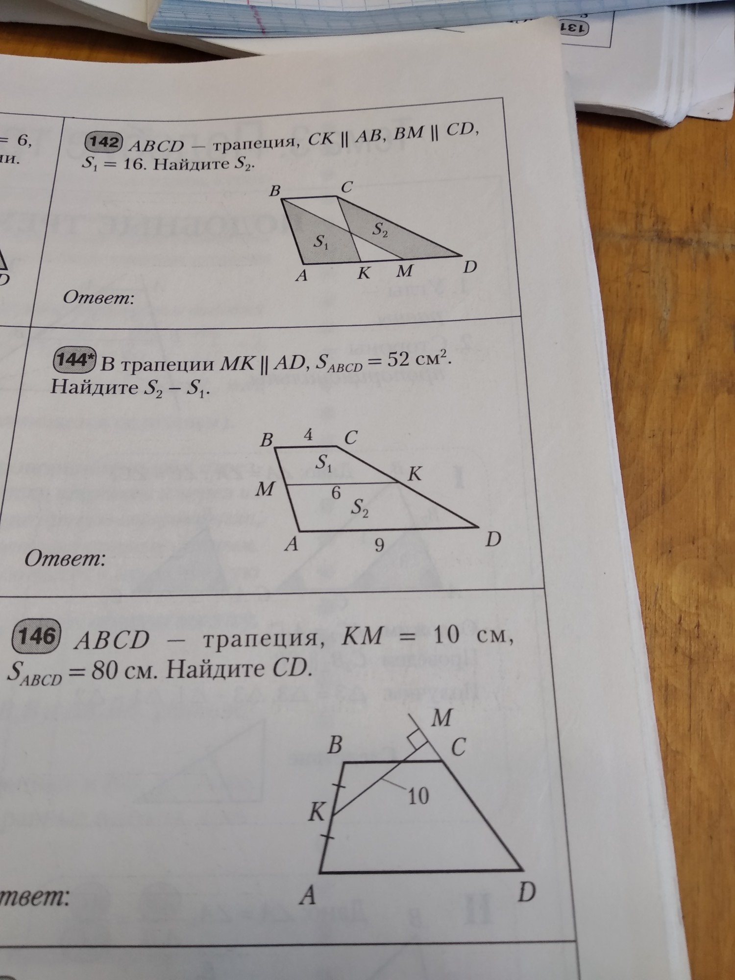 Если провести высоту из С на AD то на MK отрежется часть длиной 2 см, а на основании AD часть длиной 5 см. То есть высоты трапеций BCKM и MKDA относятся как 2:3 (то есть 2/(5-2)). Так что площадь верхней трапеции 2x*(4+6)/2 = 10x, нижней 3x*(6+9)/2 = 22.5x, а всей 5x*(4+9)/2 = 32.5x Из последнего найдем x = 52/32.5 = 1.6 Так что разница площадей трапеций составит 22.5x - 10x = 12.5x = 12.5*1.6 = 20