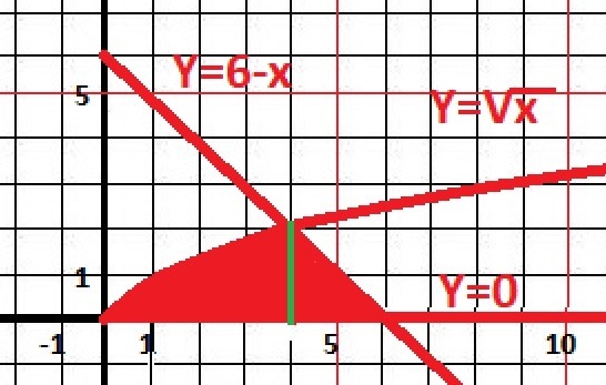 Рисунок к задаче в приложении. Два участка. От Х=0 до Х=4 функция Y = √x и от х= 4 до х = 6 функция Y = 6-x,