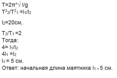 определите первоначальную длину математического маятника,если при увеличении его длины до 20 см период колебания маятника увеличивается в 2 раза срочно!!!!!!