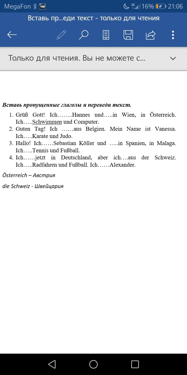 4)Ich WOHNE jetzt in Deutschland, aber ich KOMME aus der Schweiz. Ich MAG Radfahren und Fussball. Ich HEISSE Alexander.